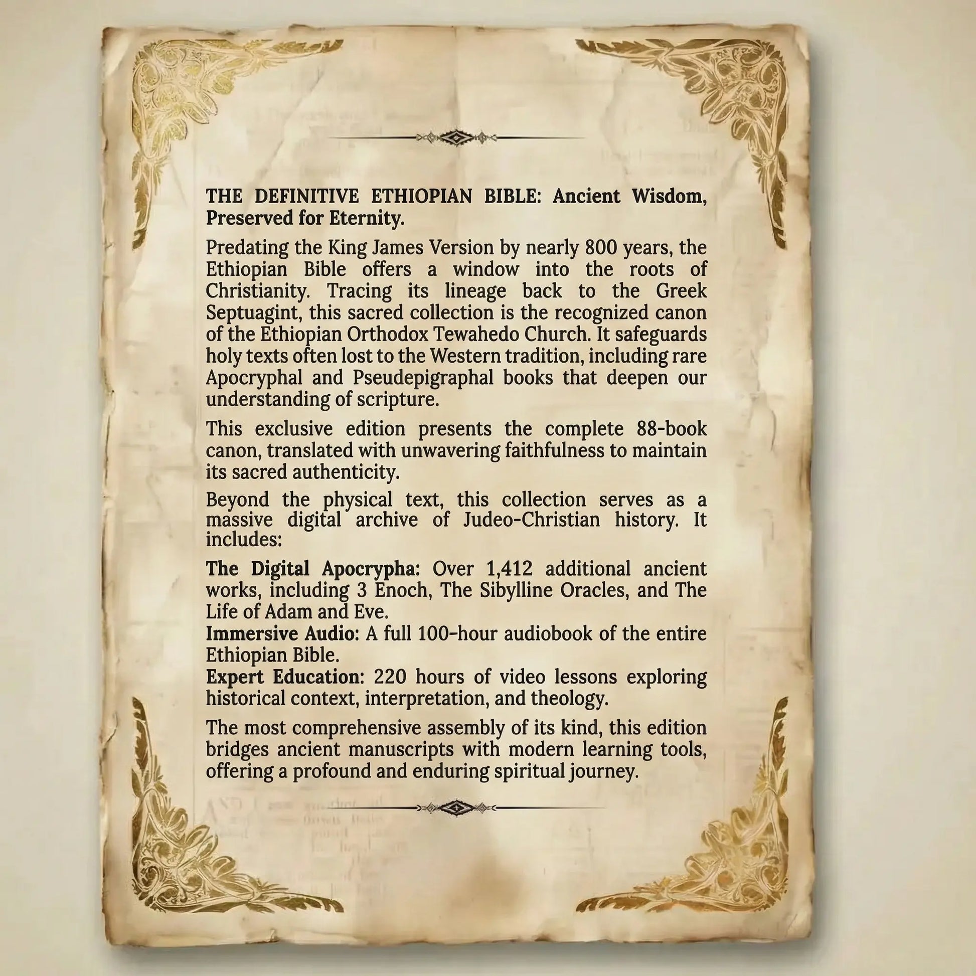 This Bible contains ancient texts such as 1 Enoch, Jubilees, 4 Baruch, The Shepherd of Hermas, and others. Many of these writings were respected by early Christian communities and referenced in scripture, even though they were later excluded from most modern Bibles.
